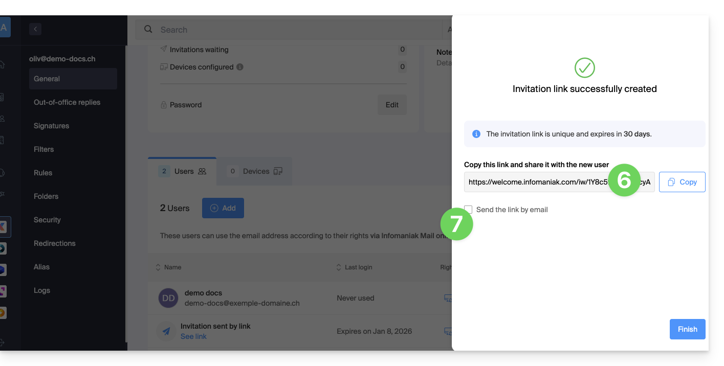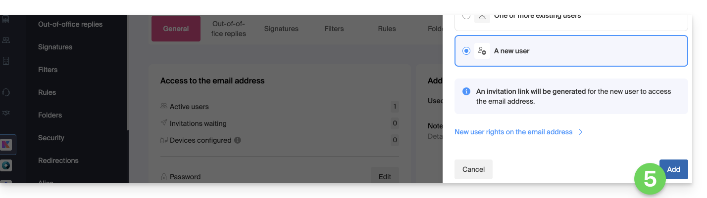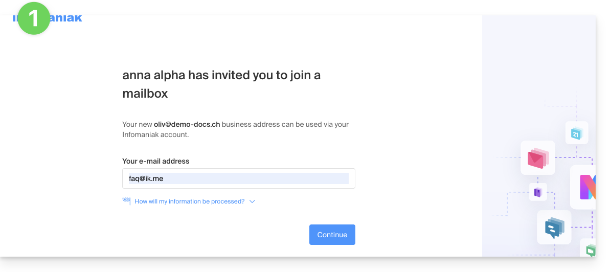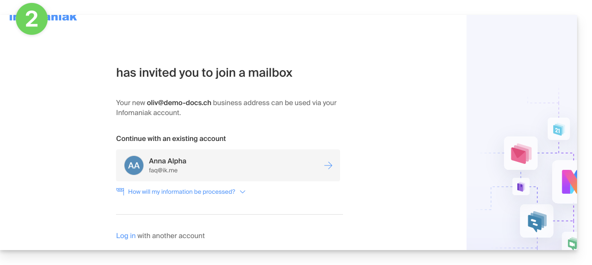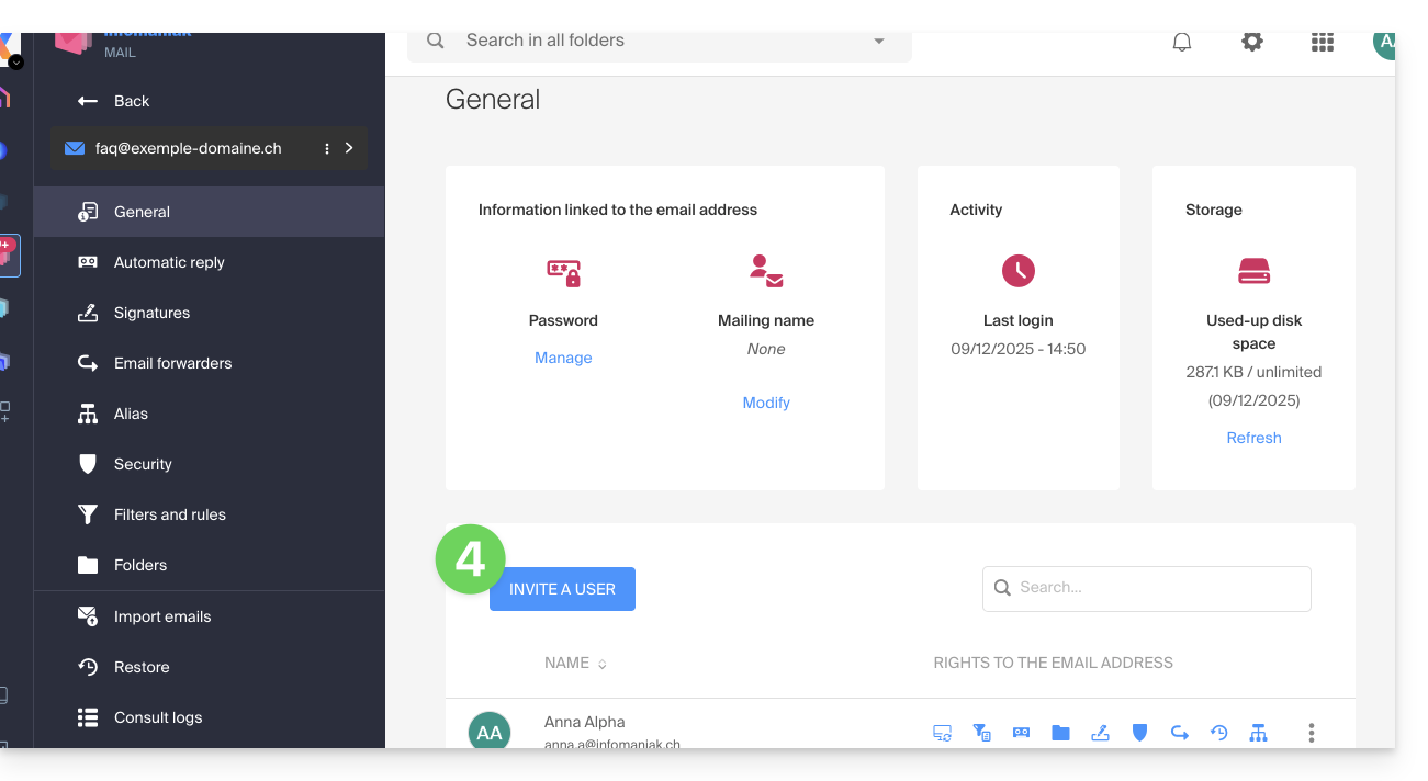 - L'adresse mail sera ajoutée automatiquement à l'interface Mail Infomaniak de l'utilisateur, après son acceptation de l'invitation.