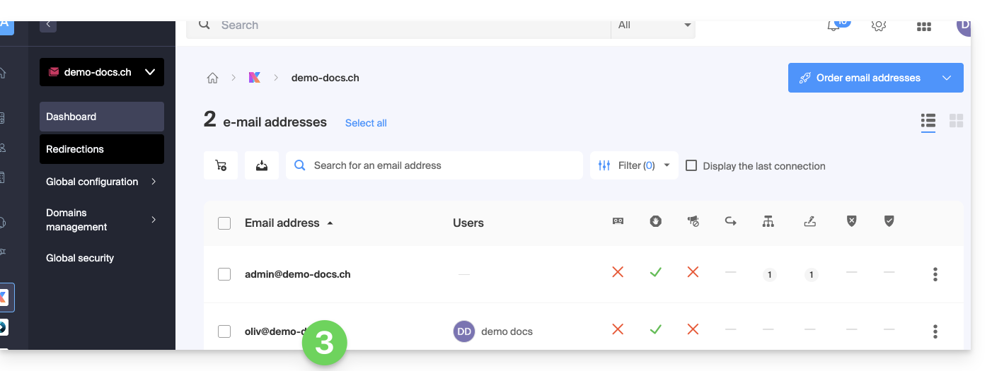 - Cliquez sur l'adresse mail concernée dans le tableau qui s'affiche: