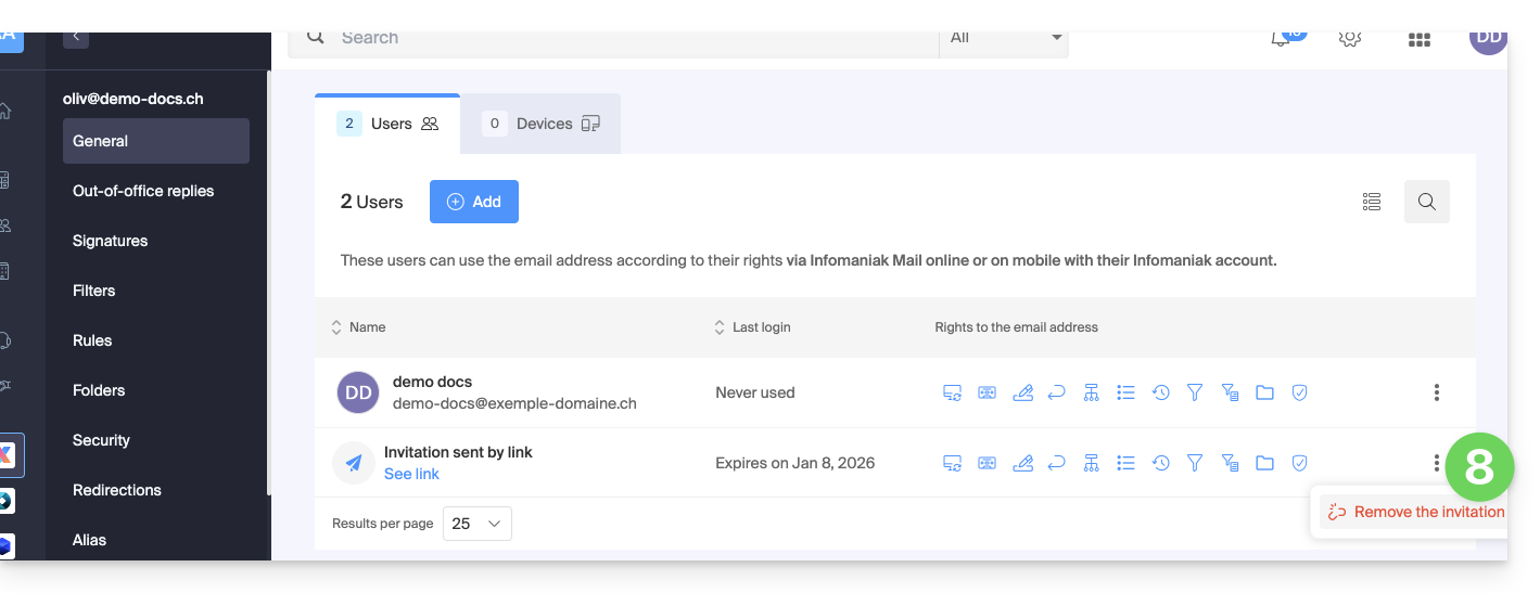 - L'invitation est visible sous l'onglet des utilisateurs de l'adresse mail, et il est possible de la supprimer en tout temps: