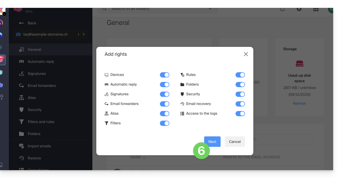 - Modifiez si nécessaire les permissions accordées à l'utilisateur pour l'adresse mail concernée et cliquez sur Suivant: