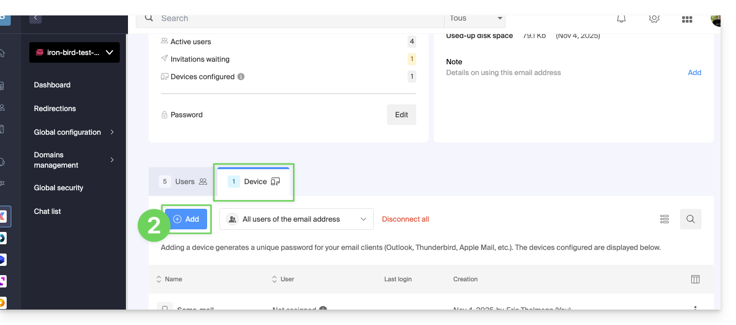 - Une fois l'utilisateur ajouté, basculez sur l'onglet des appareils pour ajouter un nouvel appareil: