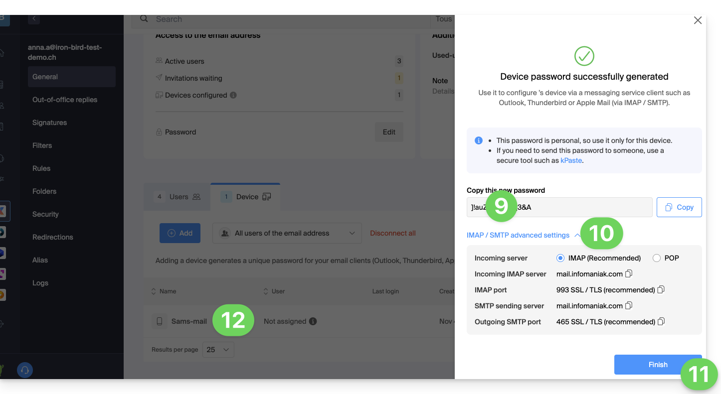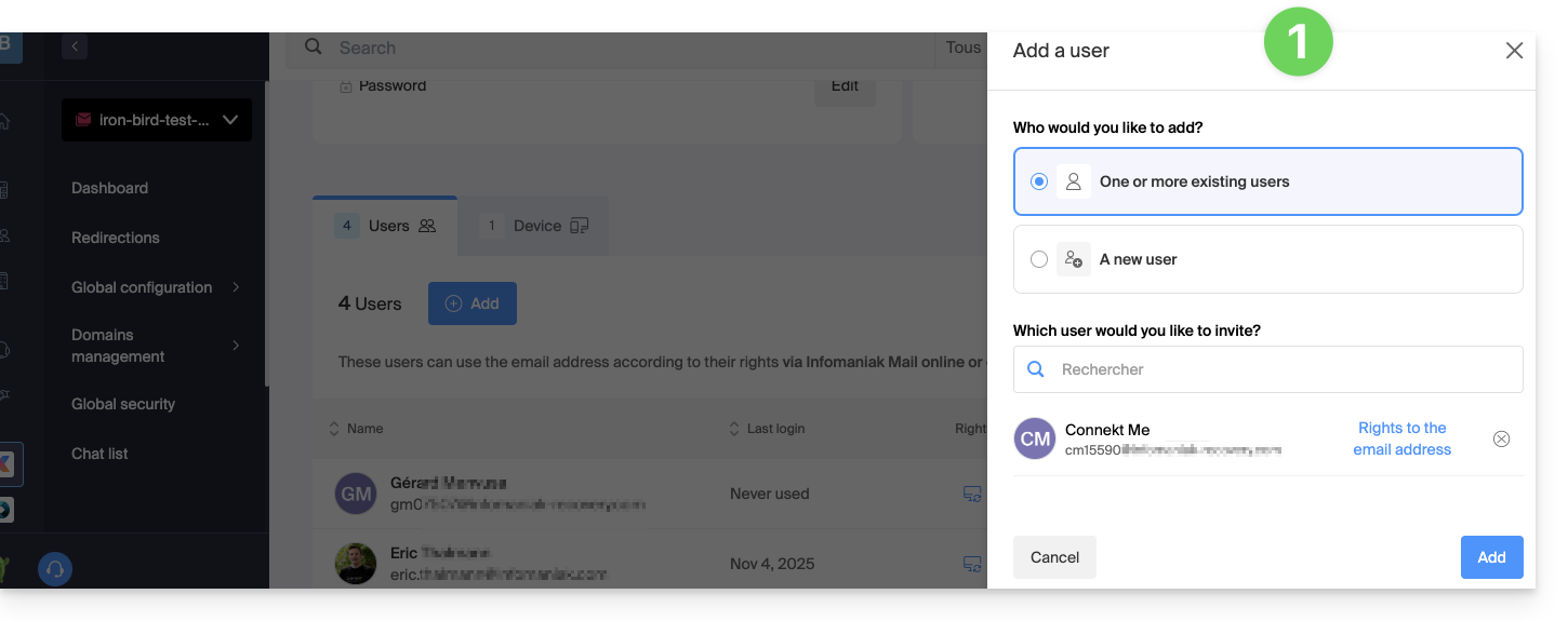 - Entrez si nécessaire le mot de passe de connexion à votre compte Infomaniak puis sélectionnez l'utilisateur créé au point 1.