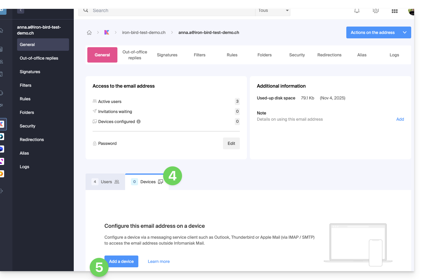 - Créer une ou plusieurs adresses sur ce Service Mail.