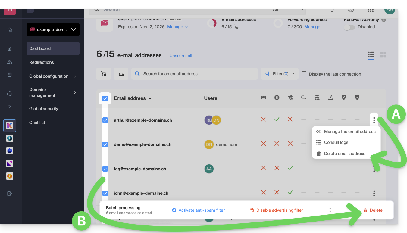 Supprimer une ou plusieurs adresses mail