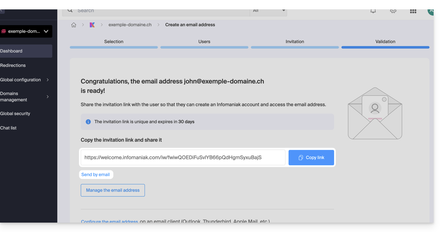 Le lien d'invitation valable 30 jours le conduit vers une page sur laquelle, selon vos choix initiaux, il pourra soit se créer un nouveau compte ou se connecter à un éventuel compte qu'il posséderait déjà chez Infomaniak, ou se créer un nouveau compte dont l'identifiant devra obligatoirement être l'adresse mail créée. Une fois terminé, l'adresse sera automatiquement visible sur Mail ksuite.infomaniak.com/mail.
