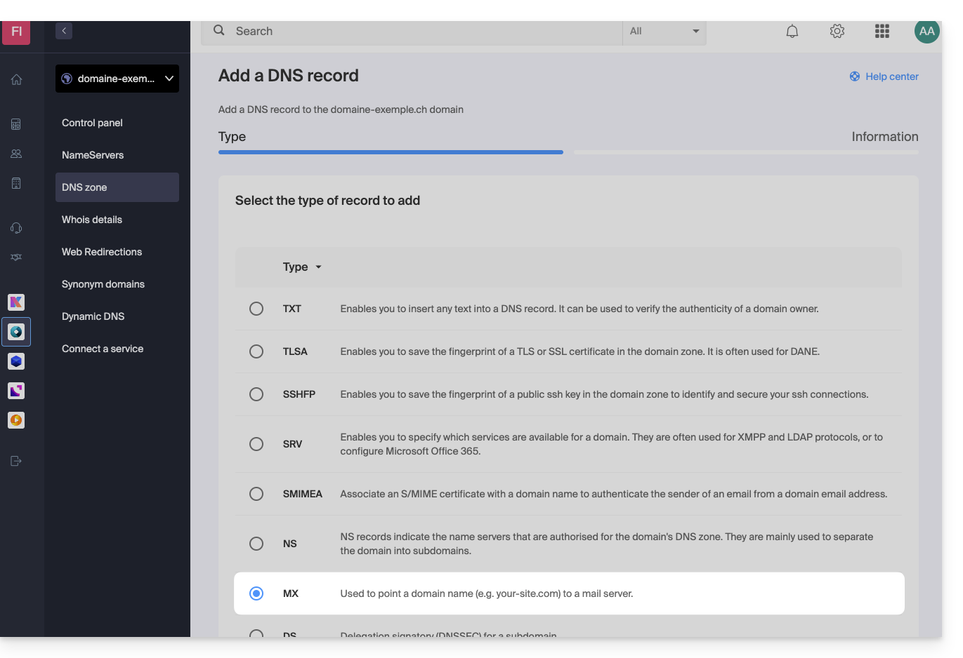 - Le type d’enregistrement “MX” permet d'indiquer chez quel fournisseur doit être gérée la messagerie (= la cible).