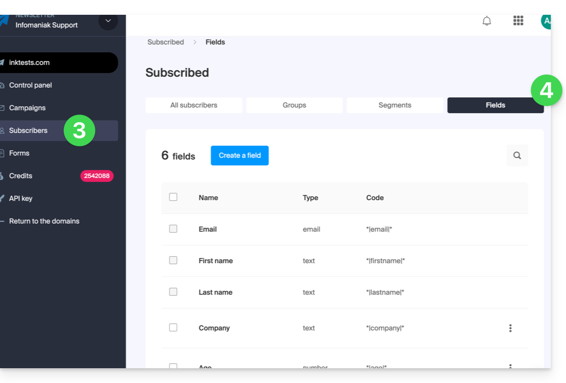 Pour gérer le nom de ces champs, ou simplement en supprimer ou en ajouter, rendez-vous dans la partie Abonnés: