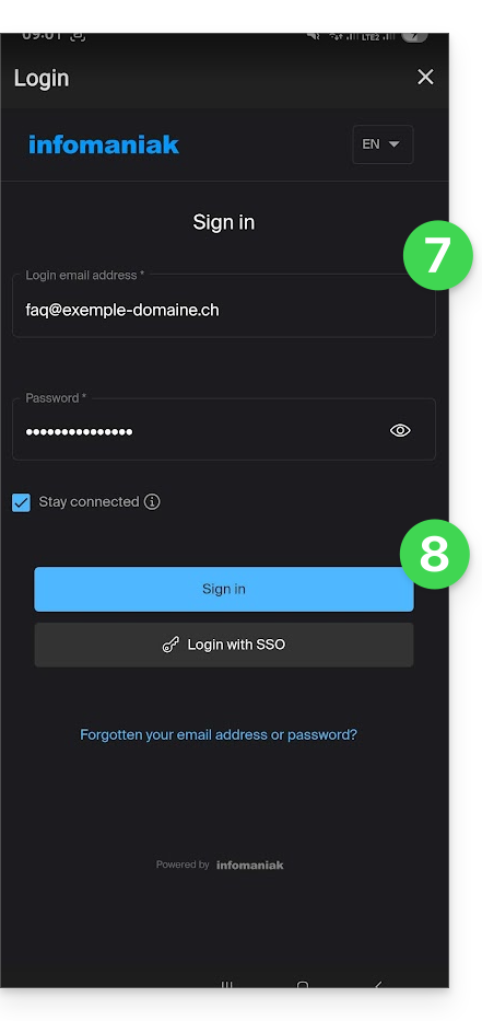7. Entrez vos identifiants de connexion Infomaniak (cf point a ci-dessus).