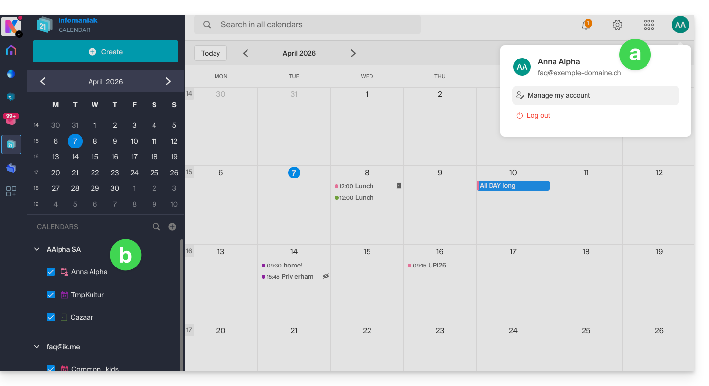 • Possibilité d'afficher ou de masquer vos différents carnets et calendriers Infomaniak directement dans ces apps.