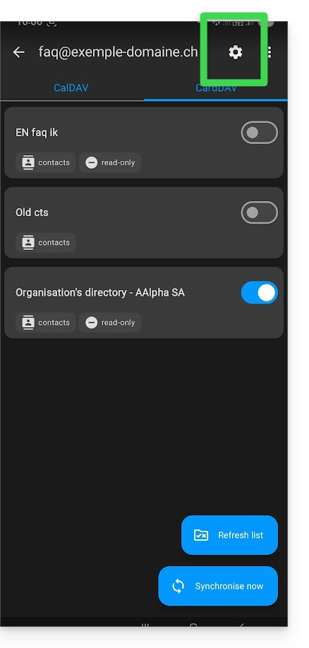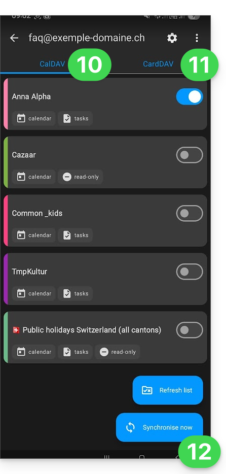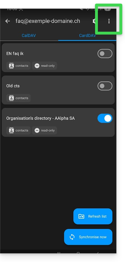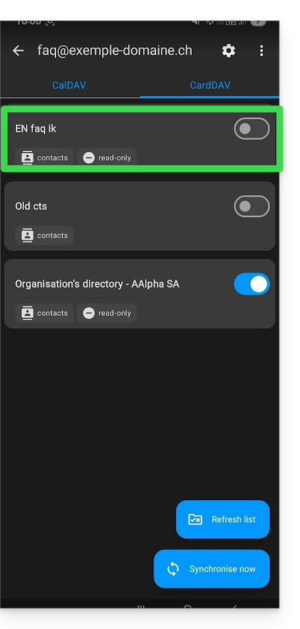 11. Sous l'onglet Carnets d'adresses CardDAV, choisissez le ou les carnets d'adresses qui devront s'afficher sur votre appareil.