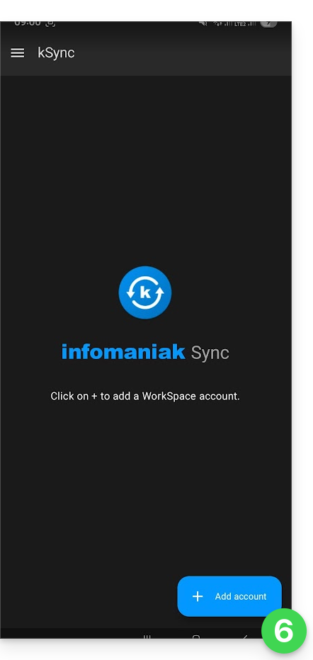 6. Appuyez pour ajouter un compte utilisateur Infomaniak (celui avec lequel vous vous connectez à vos services Infomaniak):