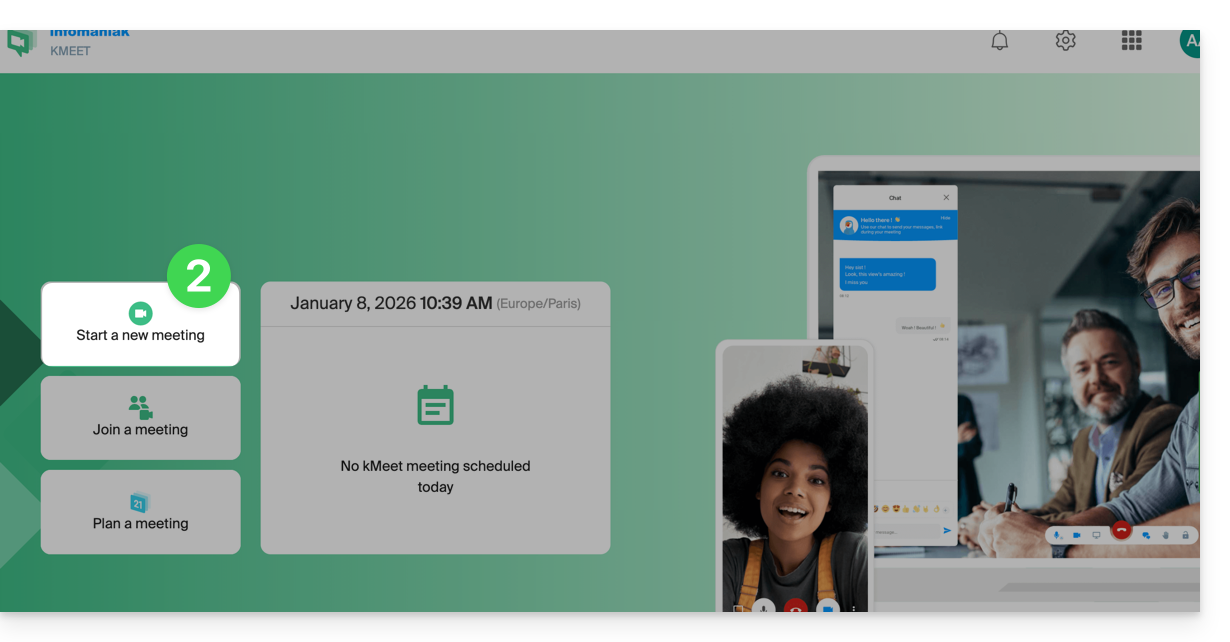 - Démarrez kMeet via kmeet.infomaniak.com ou depuis l'une des applications pour ordinateur ou appareils mobiles.