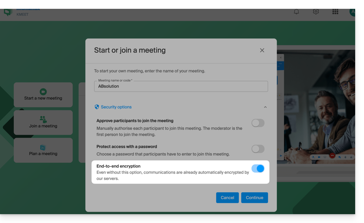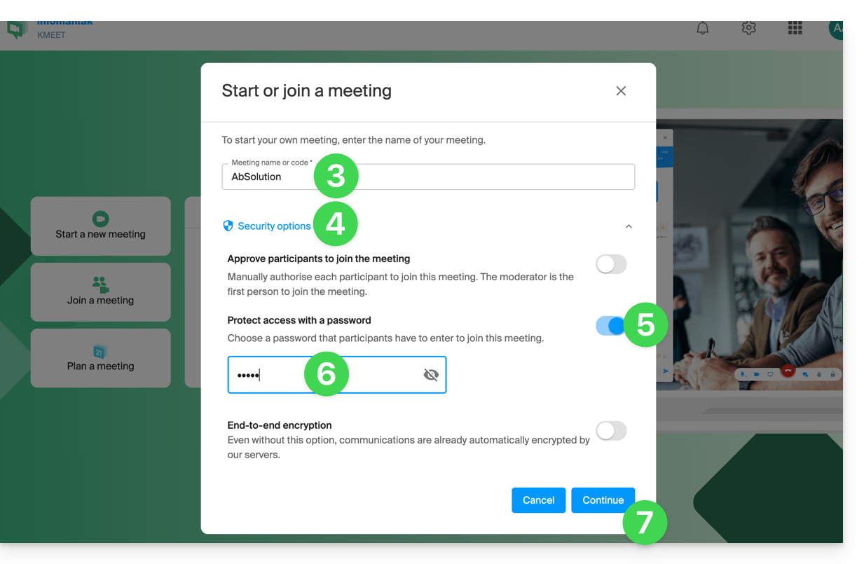 Sécuriser une réunion kMeet par mot de passe et clé de chiffrement
