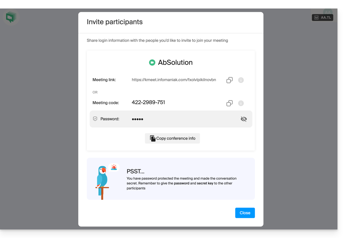 - Vous pourrez revoir le mot de passe si nécessaire en invitant des participants par le bouton dédié: