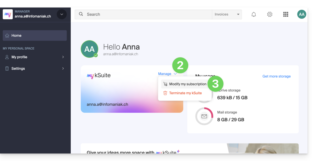 Pour accéder à l'offre my kSuite actuelle et changer pour une offre supérieure: