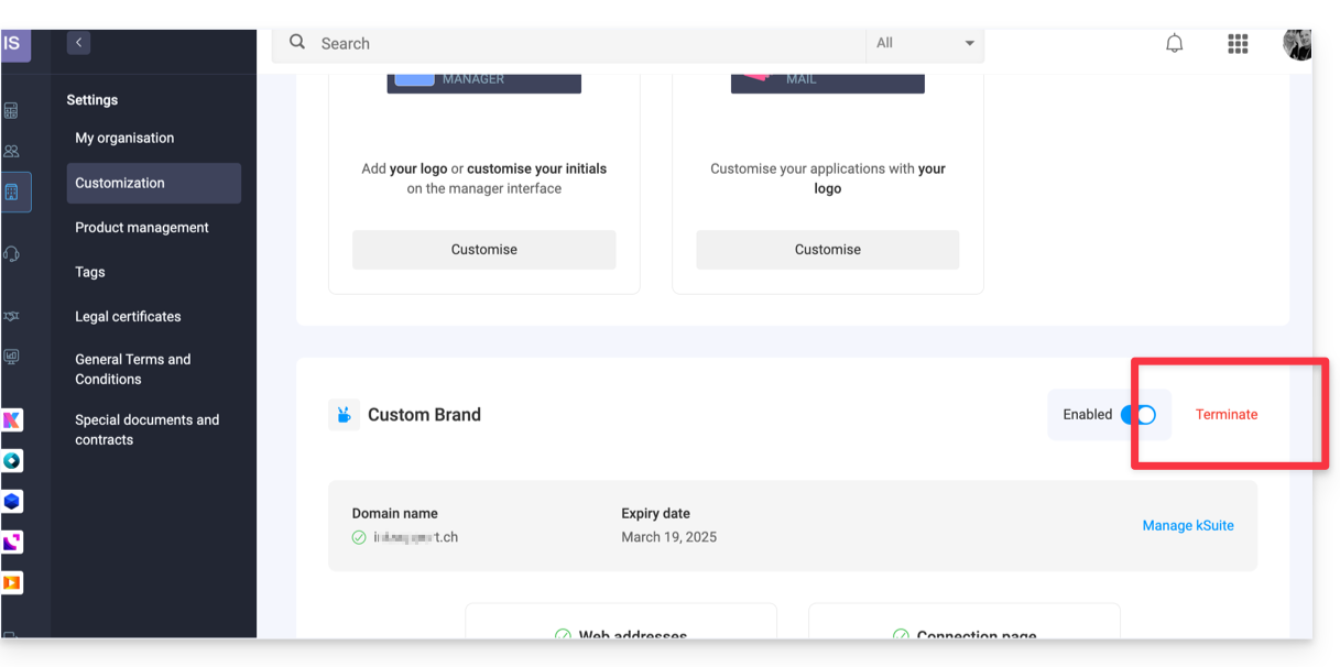 Ce guide explique comment résilier le produit de personnalisation d'URL depuis votre Manager Infomaniak.