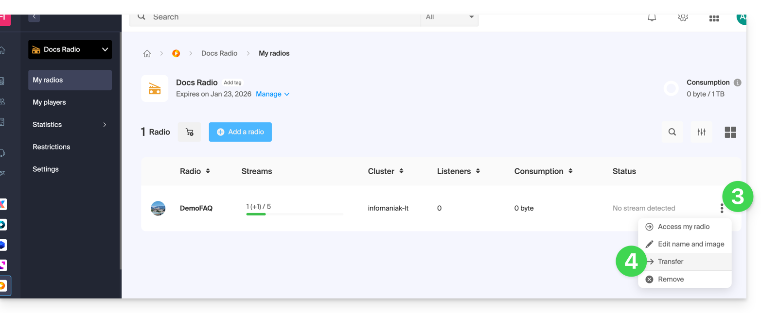 Ce guide explique comment transférer les flux audio présents sur l'un de vos Streaming Radio Infomaniak vers l'une de vos autres radios, présente sur la même Organisation.