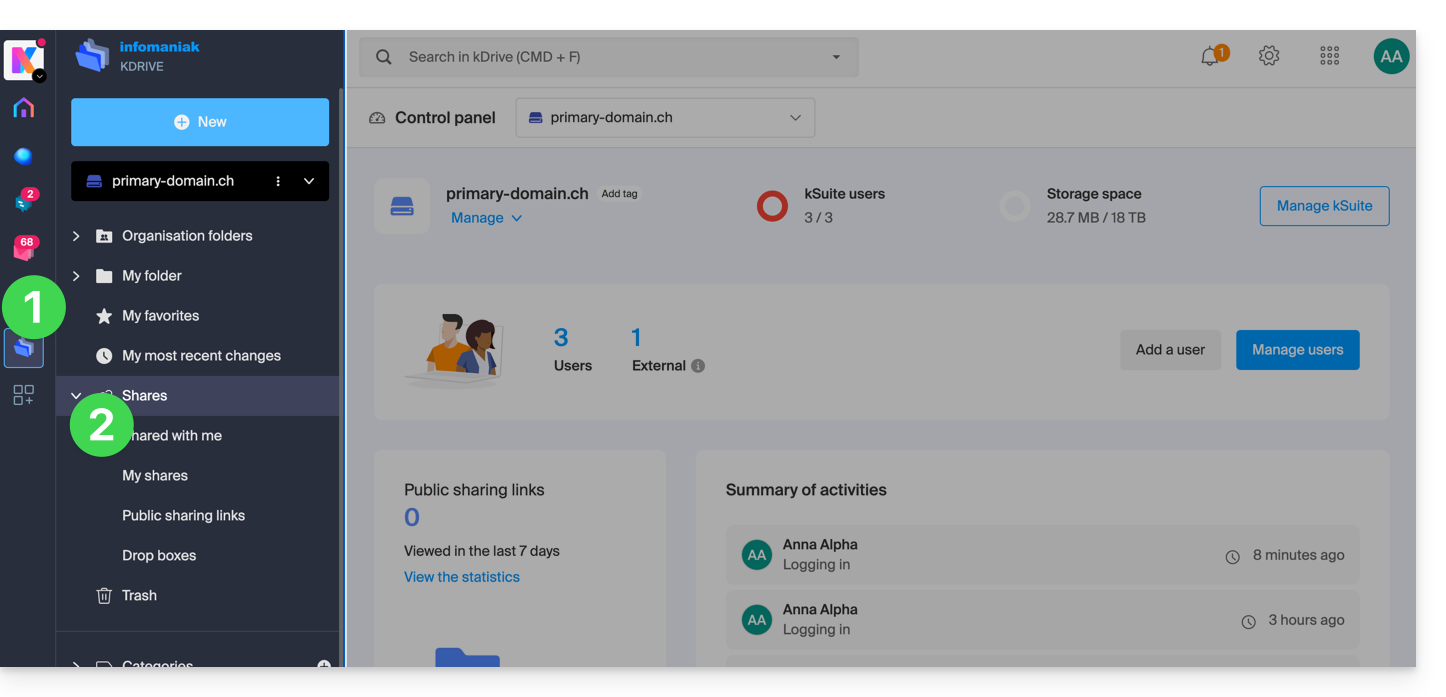 - Cliquez ici afin d'accéder à l'app Web kDrive Infomaniak (service en ligne ksuite.infomaniak.com/kdrive).