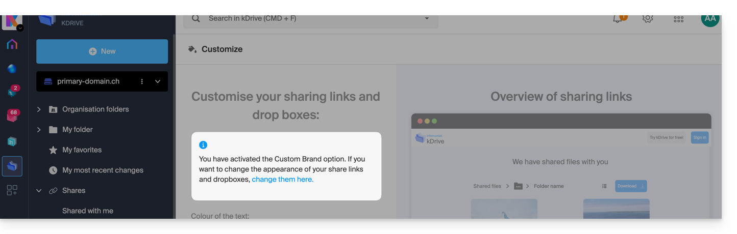 Ce guide explique comment ajouter des images de fond et modifier la couleur du texte des liens de partage et des boîtes de dépôt kDrive afin que cela soit en accord avec l'identité graphique de votre organisation.