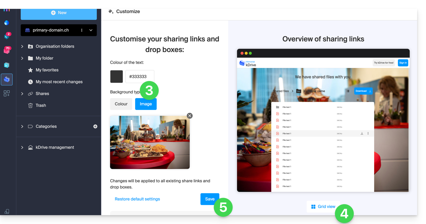 - Modifiez la couleur du texte et ajoutez une image (min. 100 Ko ; elle doit se trouver sur kDrive) ou une couleur de fond.