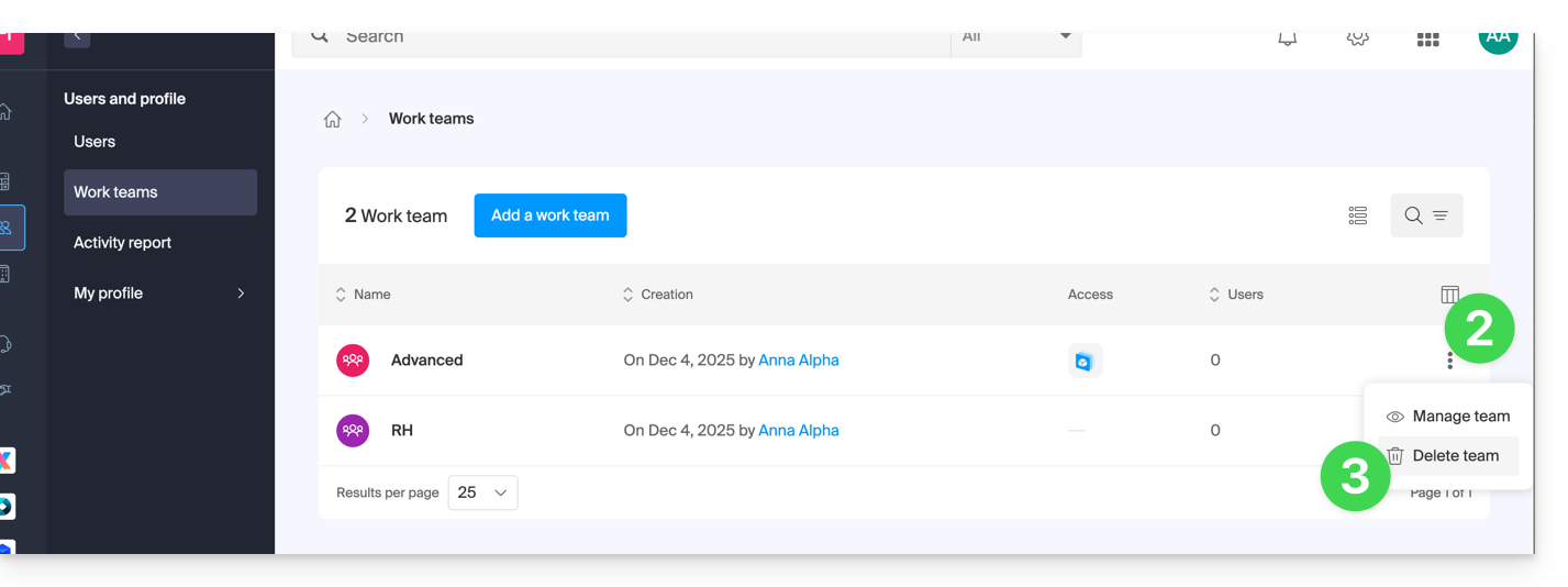 La suppression de l'équipe de travail est irréversible et les utilisateurs perdront leurs droits et accès aux différents produits de celle-ci.