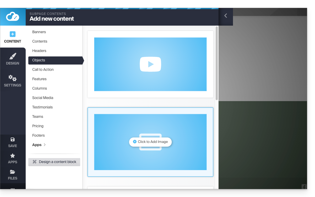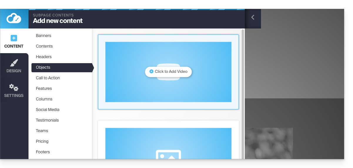 - Cliquez sur le bloc VIDEO sur la droite pour insérer une vidéo en pleine largeur: