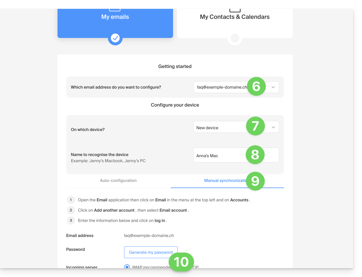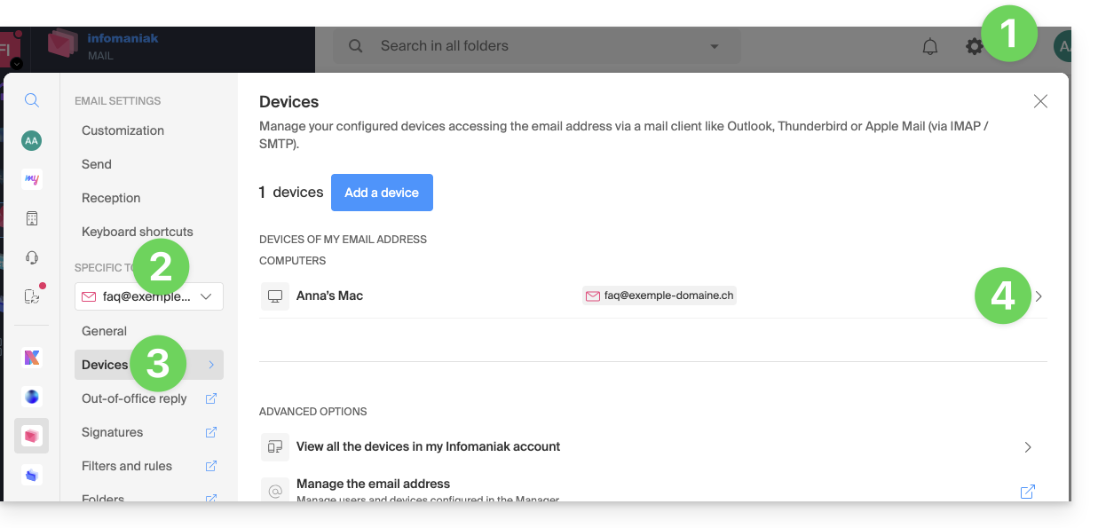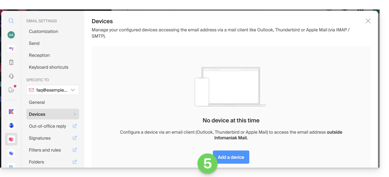 - obtenir un mot de passe pour qu'un utilisateur tiers puisse ajouter l'adresse au sein de son app Web Mail Infomaniak