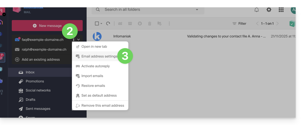 - Vérifiez ou sélectionnez l'adresse mail concernée dans le menu déroulant du menu latéral gauche.