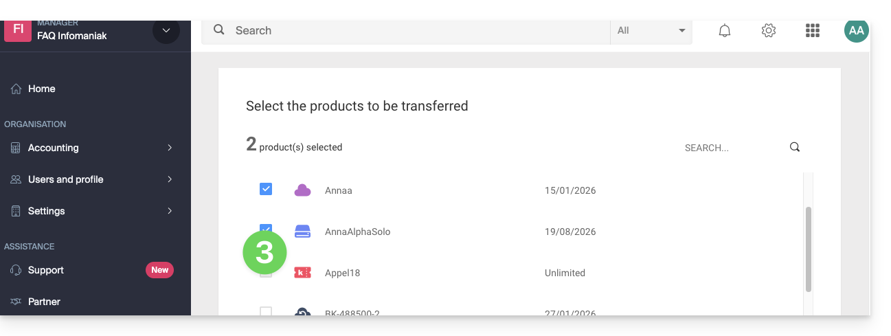 - La zone DNS du nom de domaine doit être gérée chez Infomaniak. Si nécessaire, transférez vos domaines chez Infomaniak.