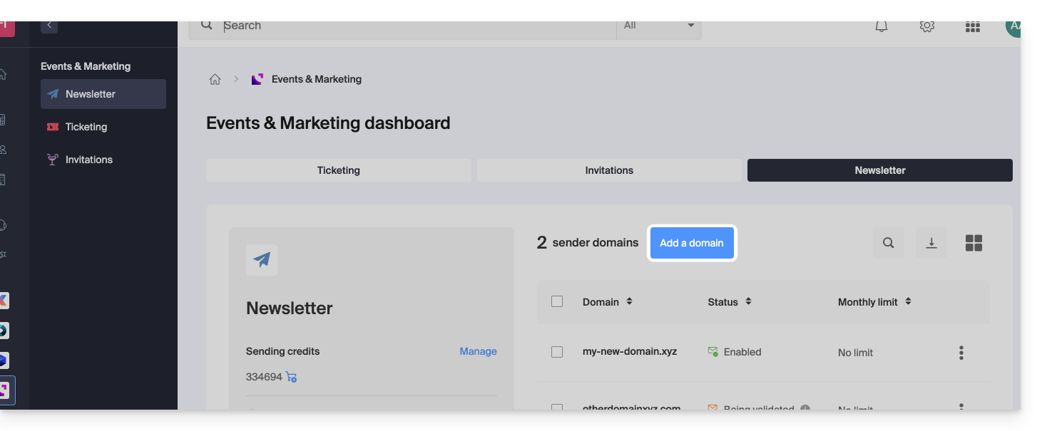 - Si vous possédez déjà une Newsletter, cliquez sur Ajouter un domaine: