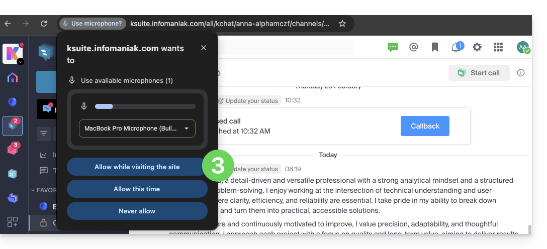 - La fonction d'appel dans kChat est disponible sur toutes les versions Web (navigateur), mobile (iOS / Android) et ordinateur (macOS / Windows).