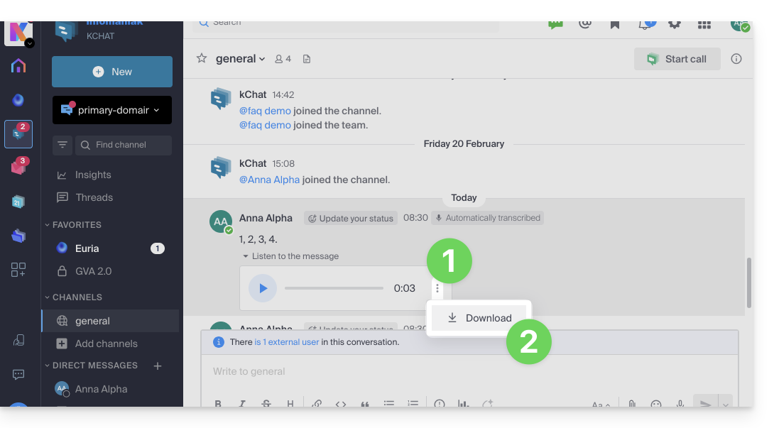 - L'appel ne sonnera pas chez les destinataires de l'appel mais ils verront un message dans kChat ainsi qu'une notification.