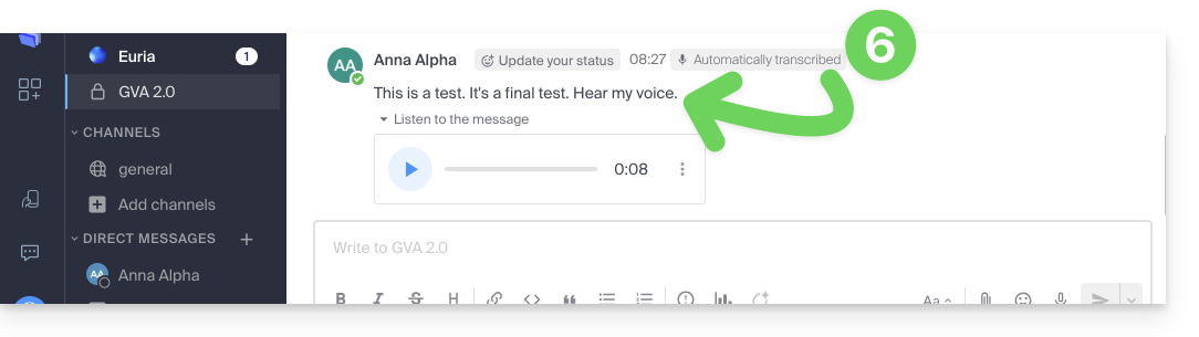 - Une fois le message envoyé, il apparait dans la discussion en cours avec son texte transcrit en clair, en toutes lettres: