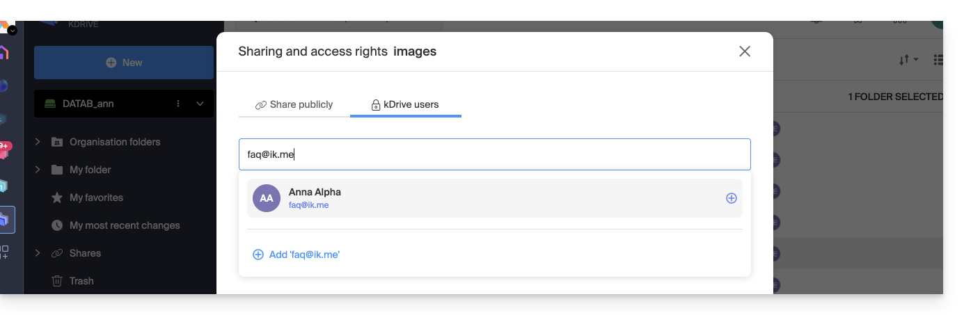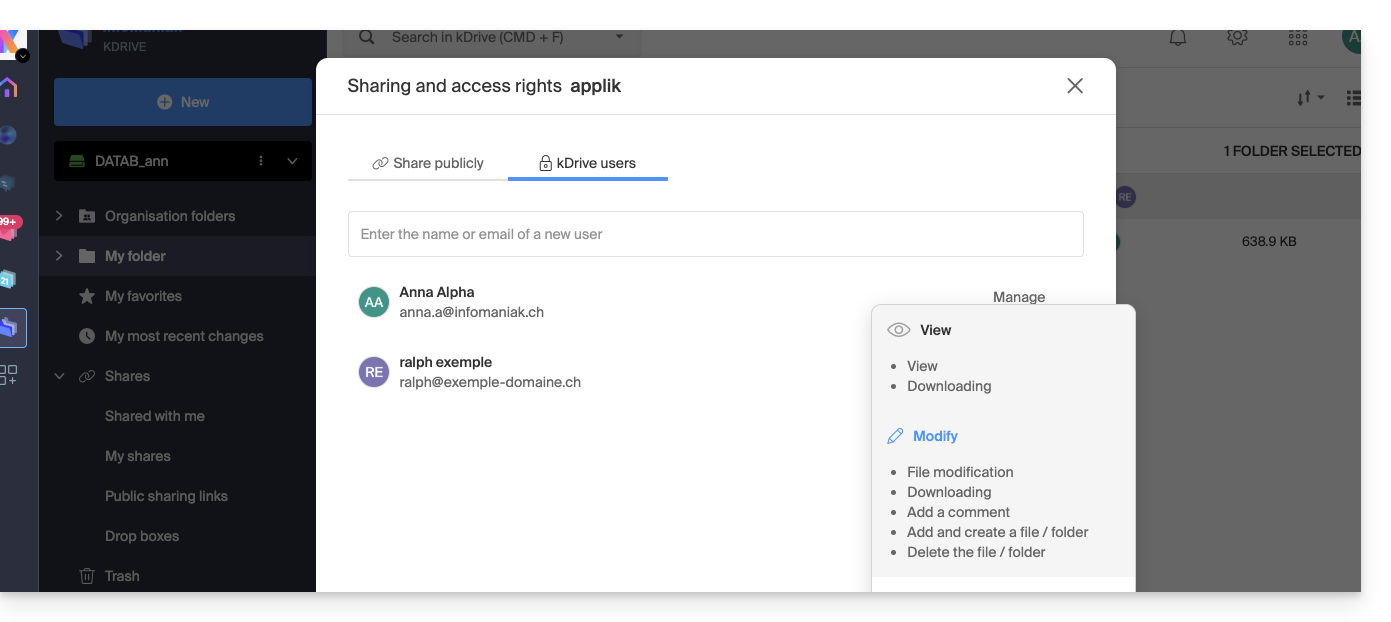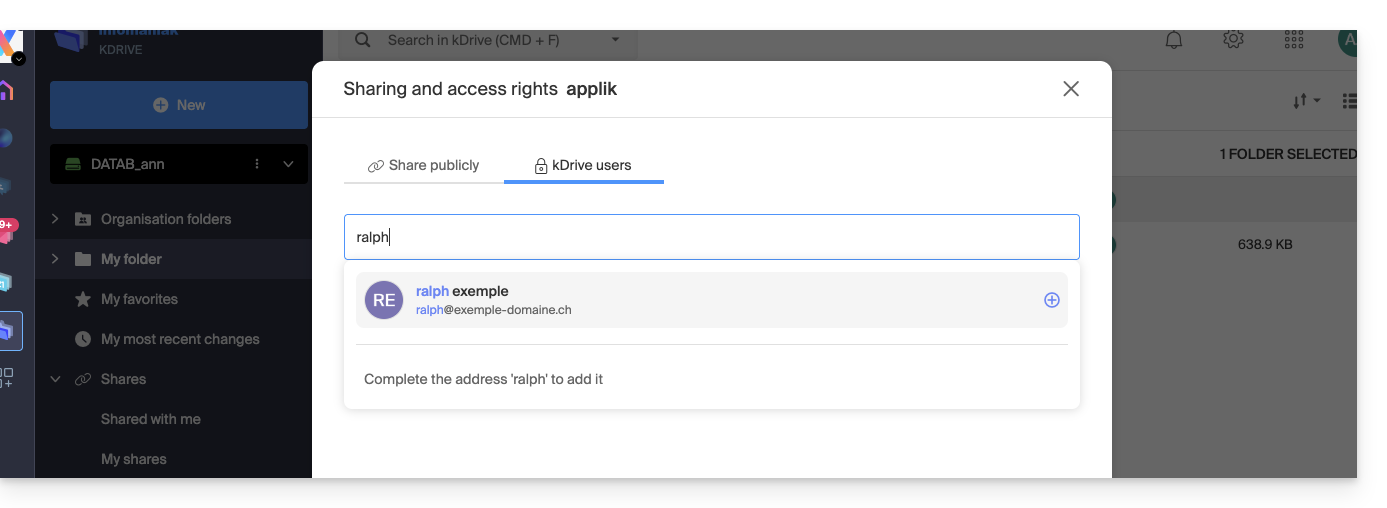 - Dans l’onglet “Utilisateurs du kDrive”, saisissez le nom d'un autre utilisateur du même kDrive:
