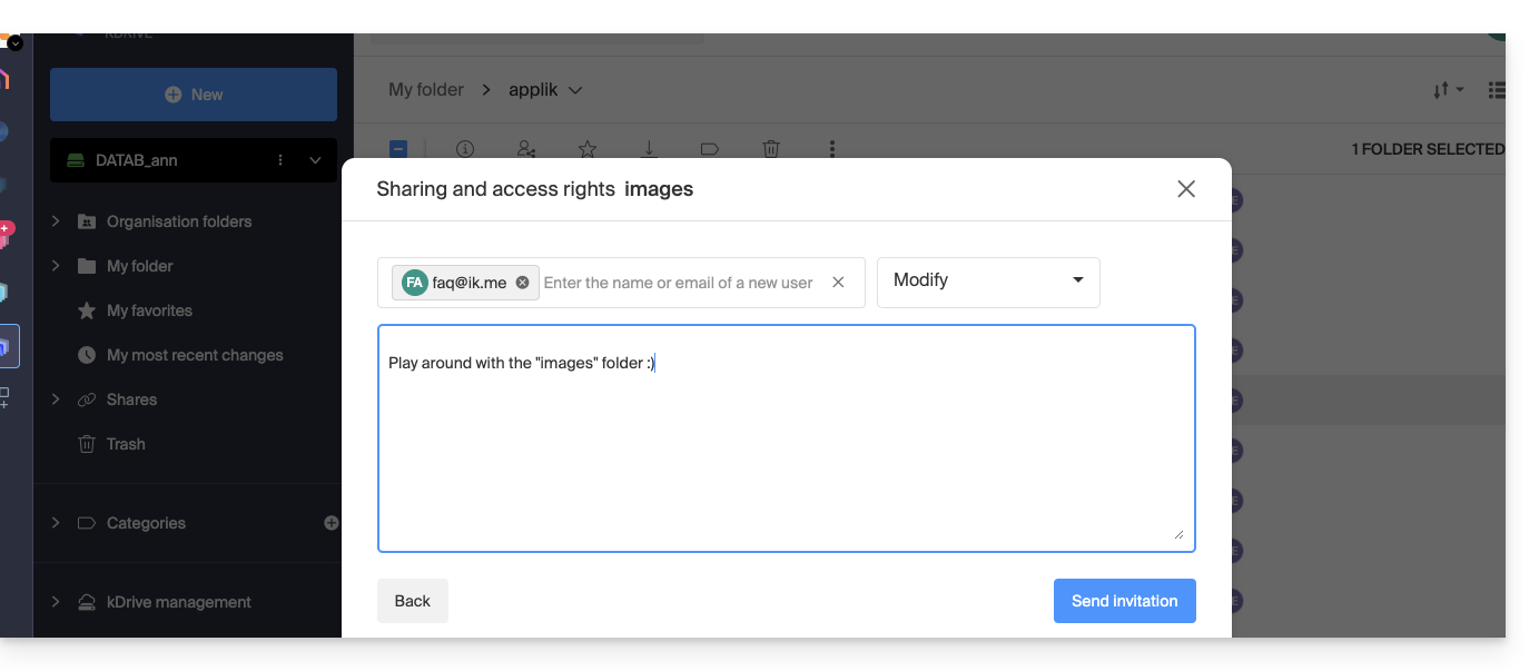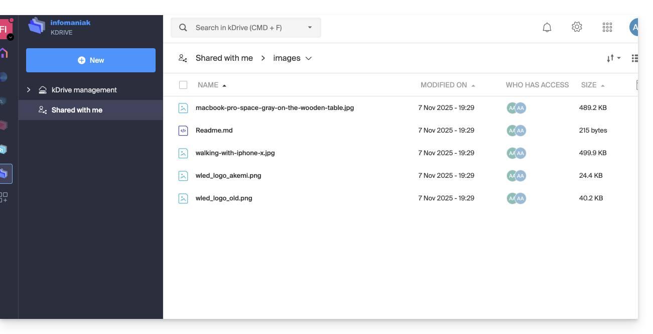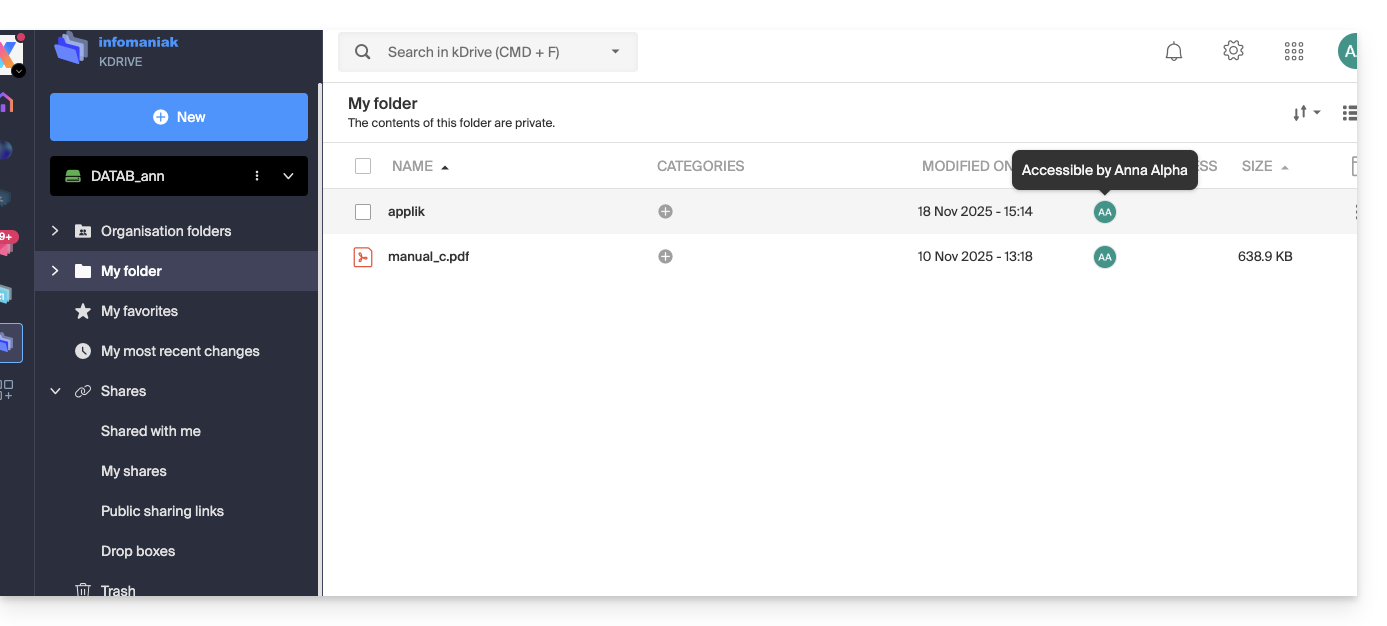 Il est possible de partager des fichiers ou dossiers de votre dossier personnel avec d’autres utilisateurs de votre kDrive, sans passer par les Dossiers de l'organisation (dossiers communs). Cela permet de contrôler précisément les accès à vos données privées.