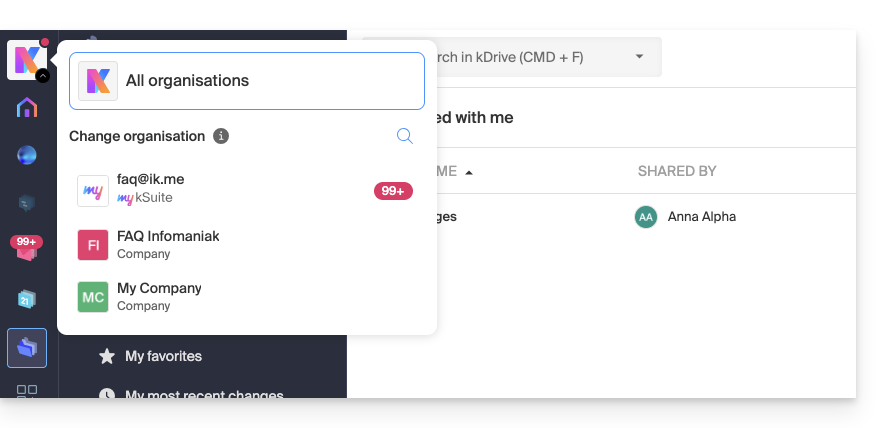 - Pour les retrouver par la suite, il peut être nécessaire au préalable d'afficher “Toutes les Organisations” pour faire réapparaitre le partage, car celui-ni n'est pas forcément lié aux kDrive des Organisations déjà accessibles par l'utilisateur: