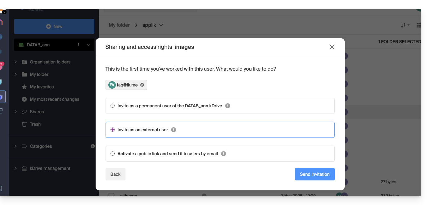 Vous pouvez également partager des fichiers ou dossiers avec des personnes qui ne font pas partie de votre kDrive. Ces partages sont appelés partages externes.