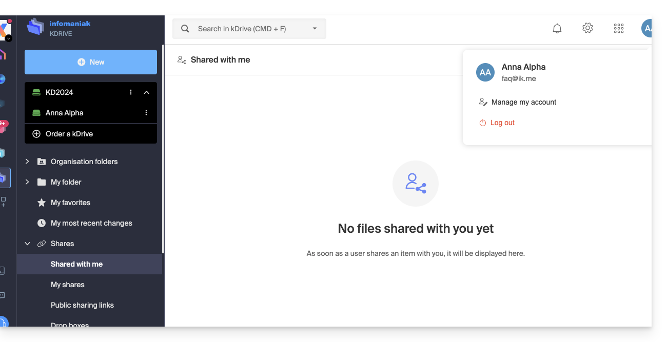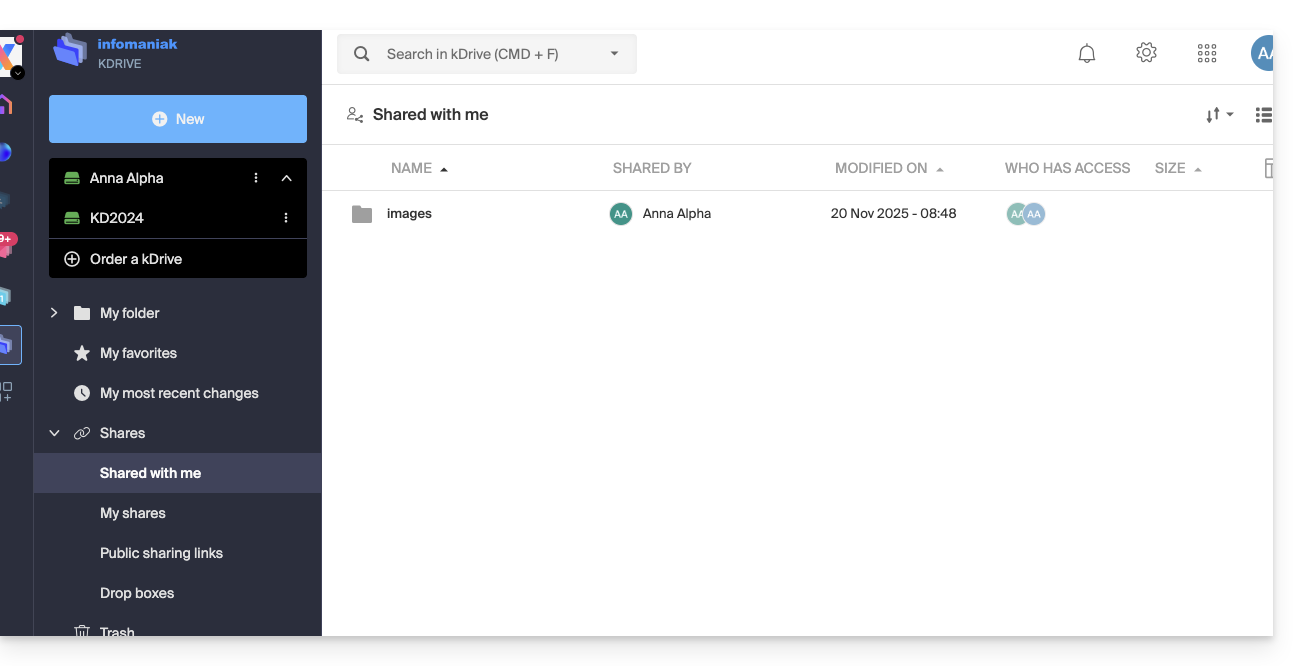 - L'utilisateur est envoyé sur la page des données partagées dans un kDrive restreint: