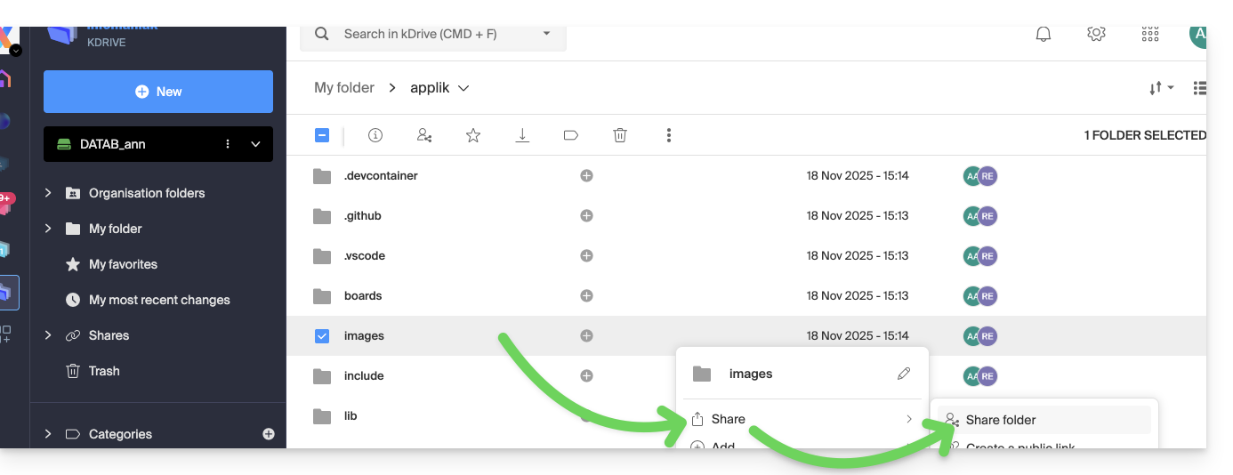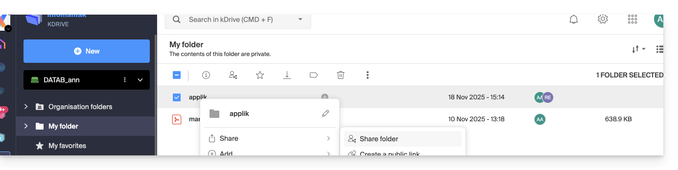 - Dans l’interface web kDrive, l'un des utilisateurs du kDrive fait un clic droit sur son dossier ou fichier à partager: