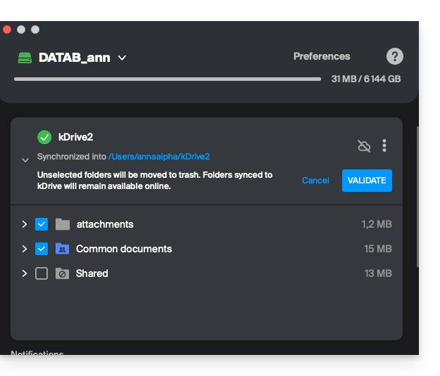 Vous pouvez activer ou désactiver la synchronisation de ce dossier depuis les paramètres de l’application desktop, en cliquant sur le chevron à côté du nom du dossier de synchronisation (kDrive2 dans l'exemple ci-dessous) pour développer l'arborescence des fichiers synchronisés, et en désélectionnant le dossier “Shared” (ne pas oublier de valider le changement):