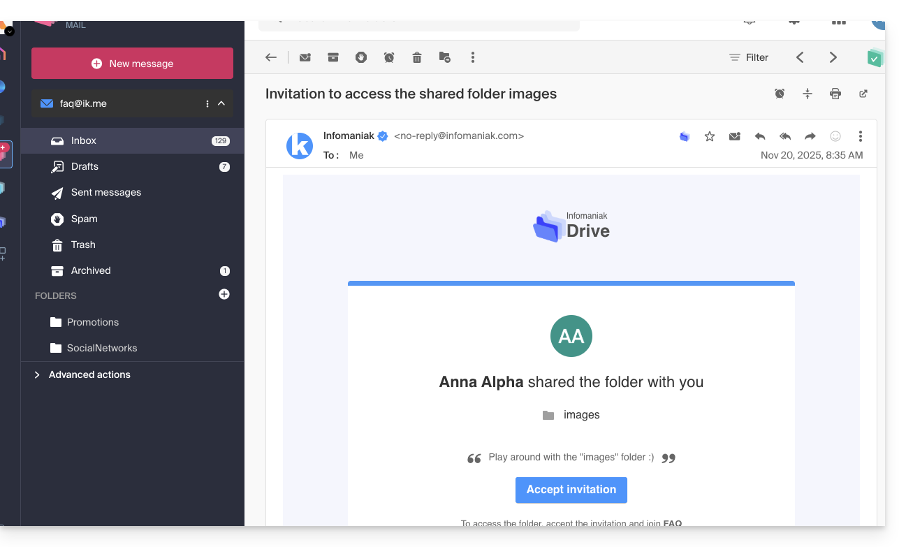 Attention : L’utilisateur externe doit disposer d’un compte Infomaniak (gratuit ou payant) pour accéder au partage. Ce n’est pas un lien public accessible par n’importe qui.