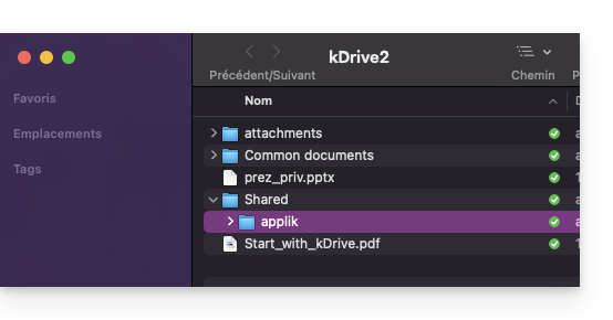 Lorsqu’un partage interne est effectué comme ci-dessus, un dossier nommé “Shared” apparaît automatiquement dans l’arborescence locale de l’application desktop chez l'utilisateur concerné, ici sur macOS: