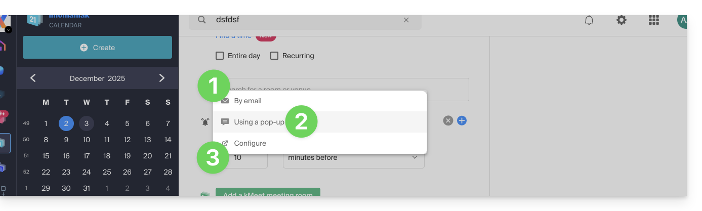 - Par une notification du navigateur: le rappel sera affiché par une notification gérée par votre navigateur Web, pour autant que kSuite soit connecté ; c'est également l'option à choisir si vous synchronisez votre agenda avec votre téléphone pour recevoir une alerte sur votre appareil.