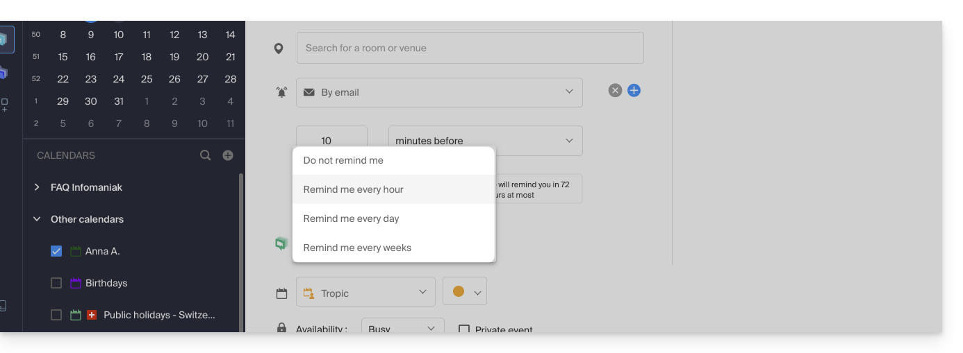 Ce guide explique le fonctionnement des rappels et alertes d'évènements sur l'app Web Calendar Infomaniak (service en ligne ksuite.infomaniak.com/calendar).
