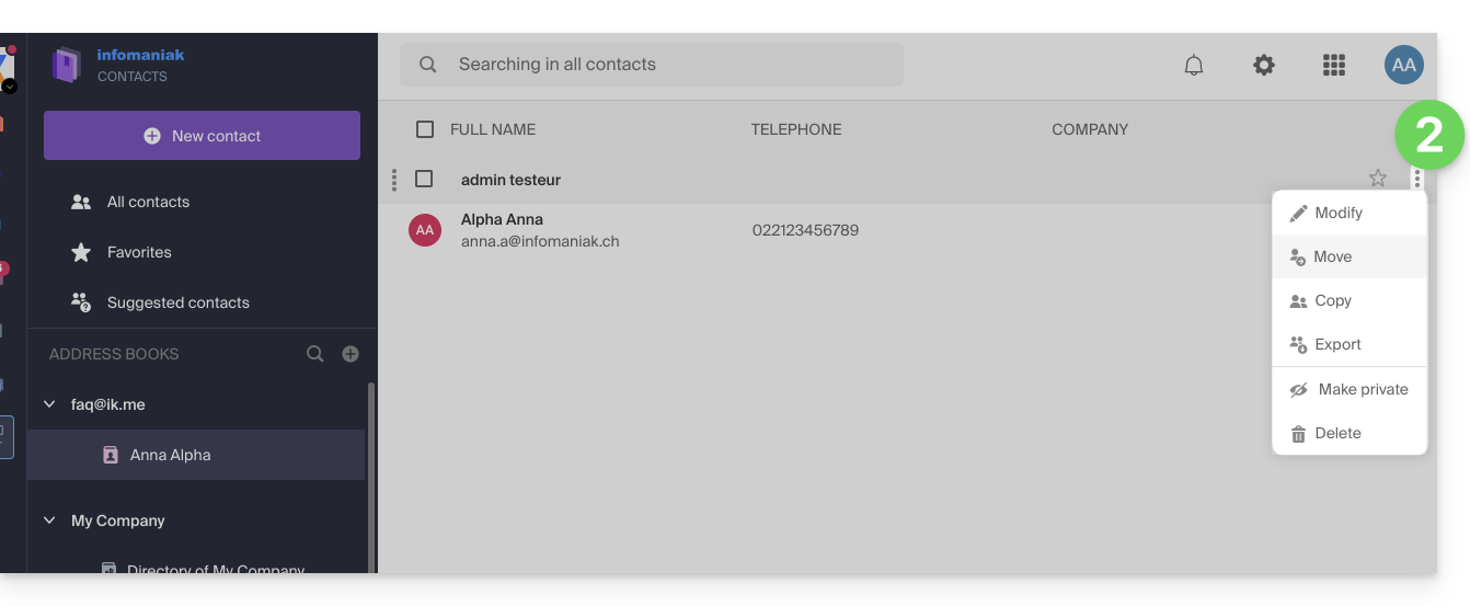 Ce guide explique comment copier ou déplacer des contacts sur des carnets d'adresses de l'app Web Contacts Infomaniak (service en ligne ksuite.infomaniak.com/contacts).