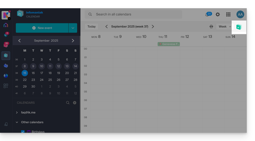 Ce guide explique comment afficher un calendrier / agenda avec les dates des jours fériés du canton ou pays de votre choix sur l'app Web Calendar Infomaniak (service en ligne ksuite.infomaniak.com/calendar).