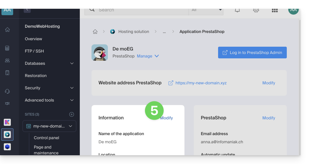 - Cliquez ici afin d'accéder à la gestion de votre Hébergement Web sur le Manager Infomaniak (besoin d'aide ?).