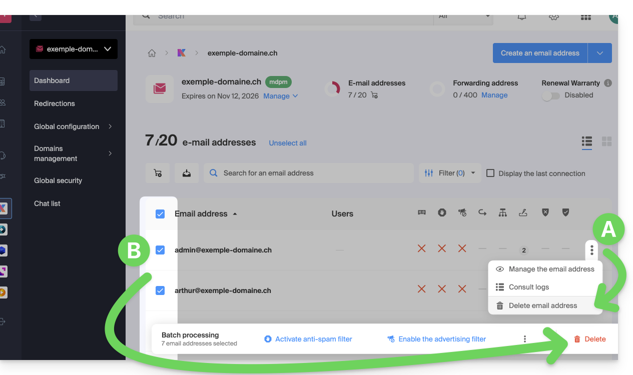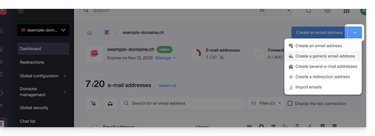 Si votre nom de domaine n'est pas géré par Infomaniak ou que votre Service Mail n'est pas géré dans le même compte utilisateur que votre nom de domaine, prenez connaissance de cet autre guide afin de lier le nom de domaine à votre Service Mail.
