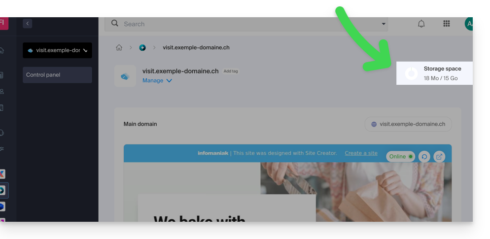 - L'espace disque à disposition en fonction de l'offre dont vous disposez est spécifié sur votre tableau de bord: