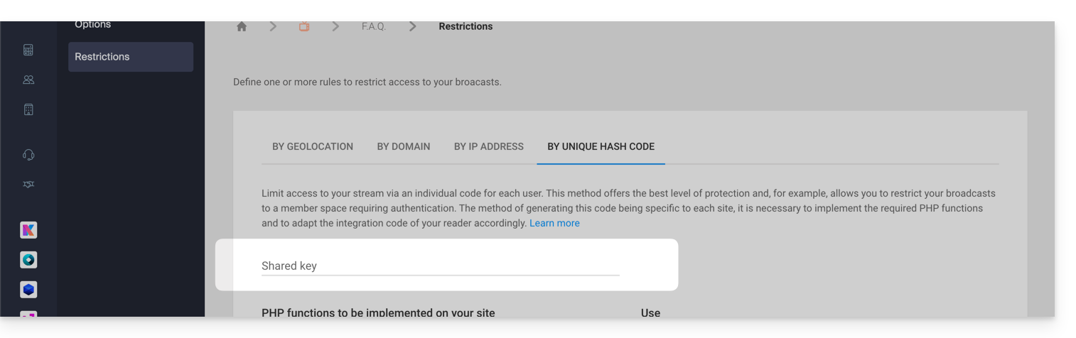 - Restrictions géographiques ou autres restrictions (blocage via IP, domaine(s), token, etc.)